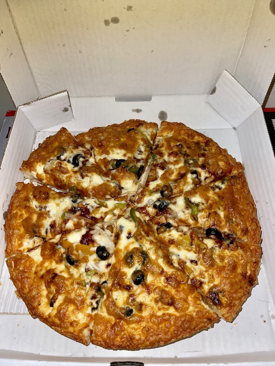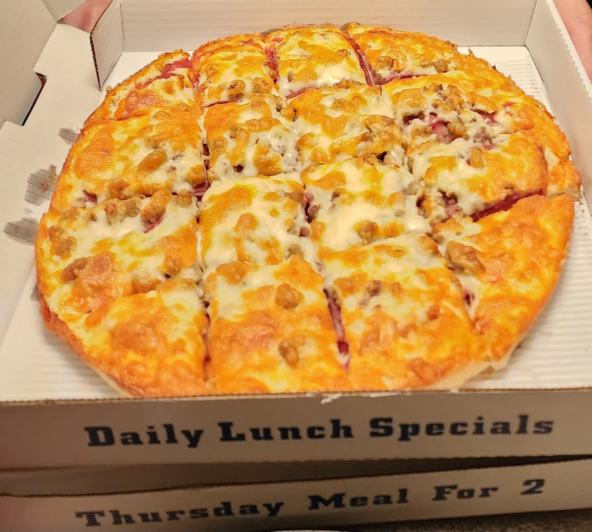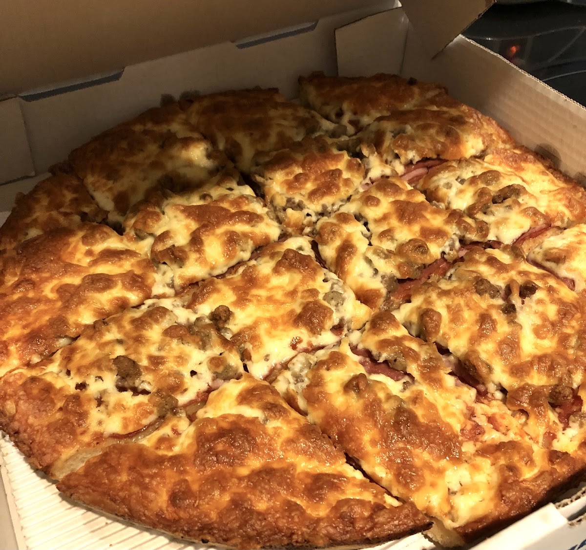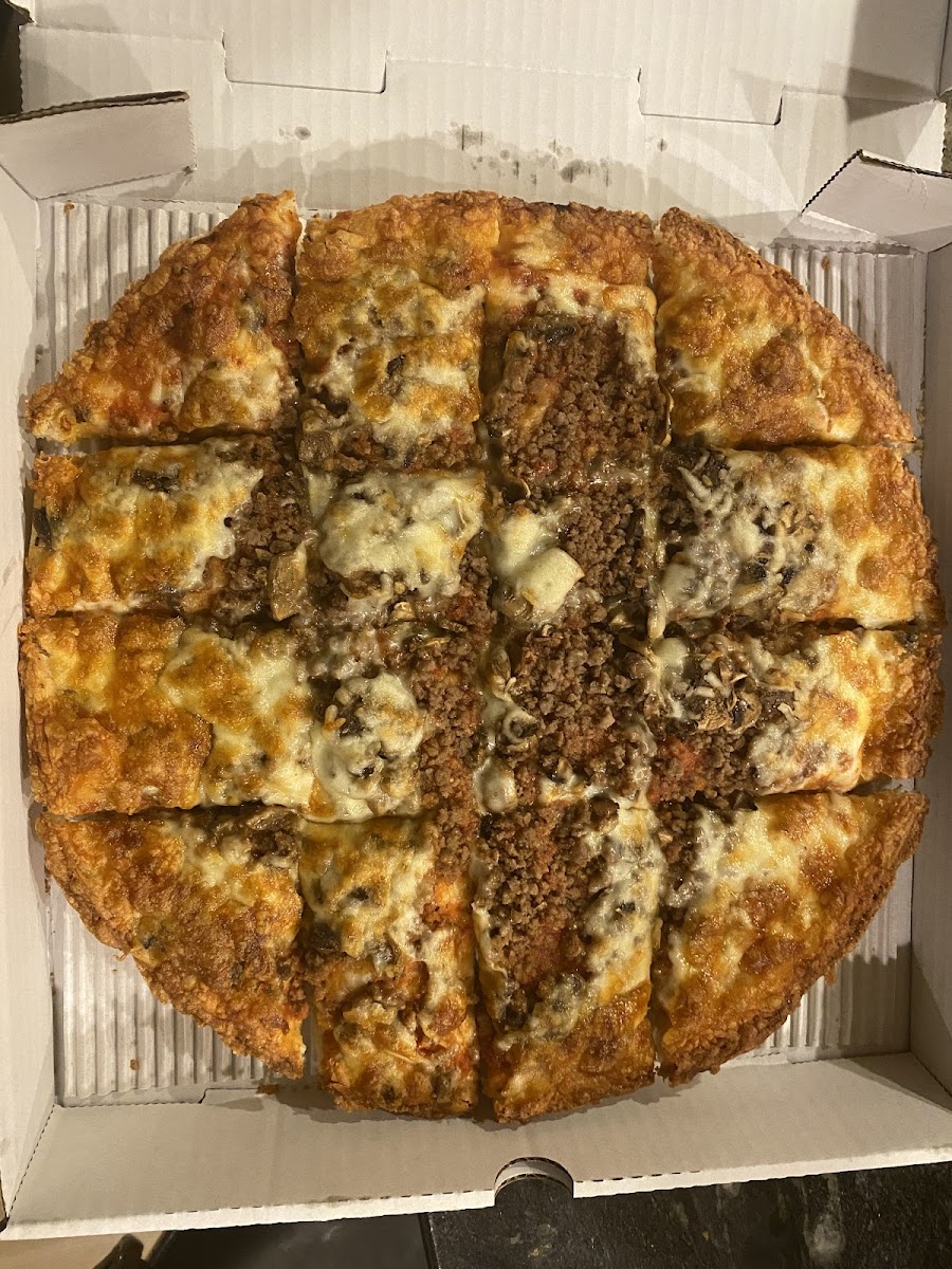 Awesome pizza! The large was a perfect size for 2-3 people and was perfectly cooked. The crust is very firm and has a Parmesan cheese blend going right to the edge of the crust. The pizza is cut into squares which I really like because I’m a crust person so I get more crust First time ordering, & I would order again. The meat was layered under the cheese and a good amount. I might ask for extra cheese next order, as I like a slightly more cheesier pizza, but that’s just my preference. It was excellent the way it was and will definitely return. Finally, great pizza in the South